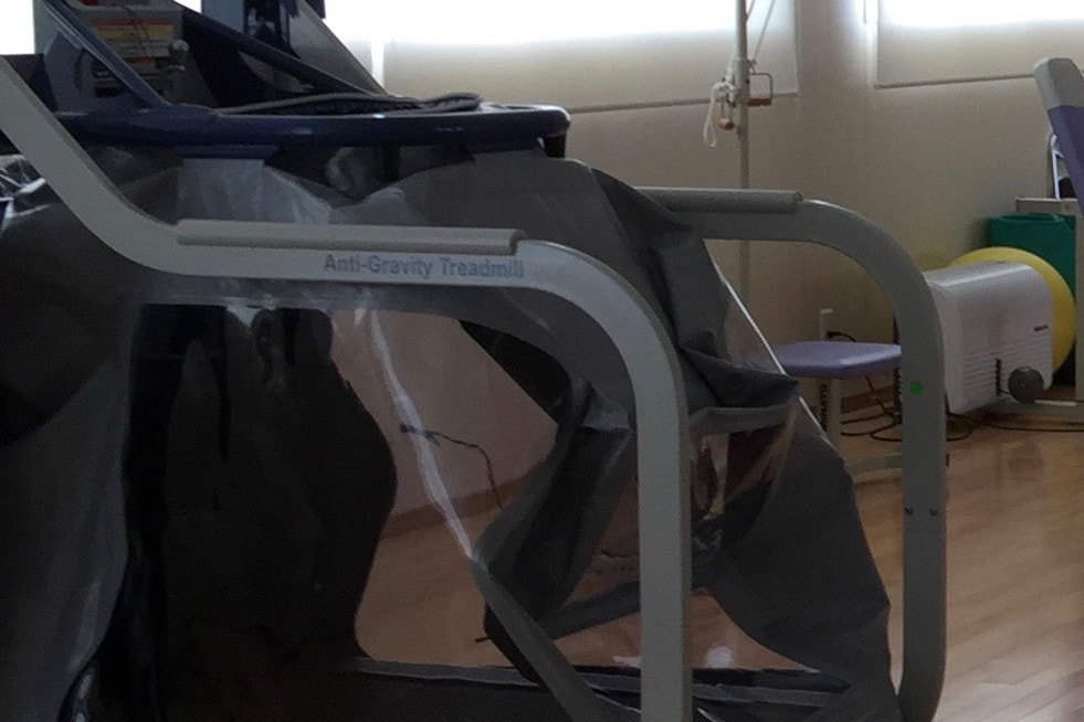 リハビリを円滑に進めるために、反重力トレッドミル(体重が全部かからないようにして行う歩行訓練機器)やサスペンションエクササイズ(天井からぶら下げたロープを利用した機能訓練)など、様々な機器を利用しながらリハビリを行なっています